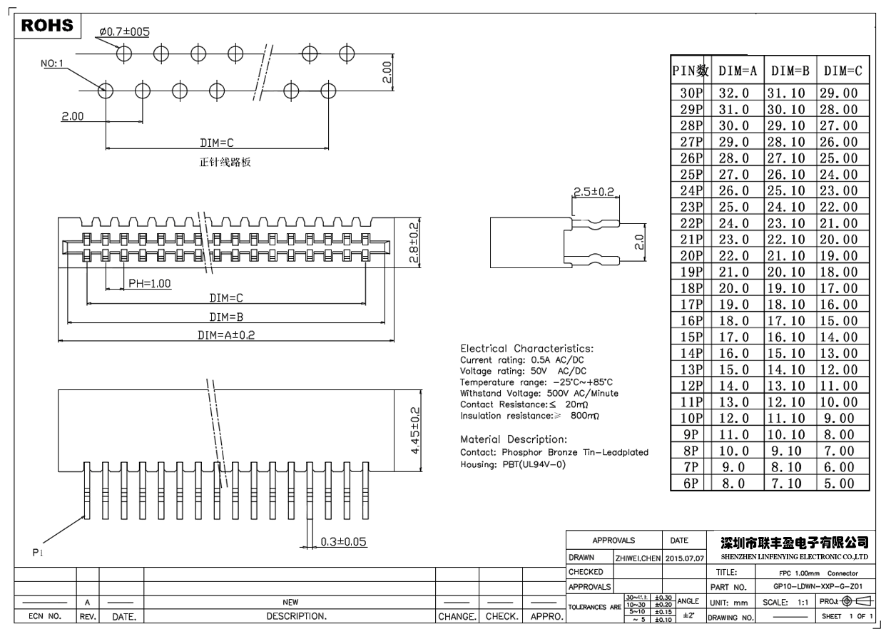 產(chǎn)品簡介品名:FPC連接器規(guī)格:立式直插/180°間距:1.0mm/正向PIN數(shù):6P-30P高度:4.45mm