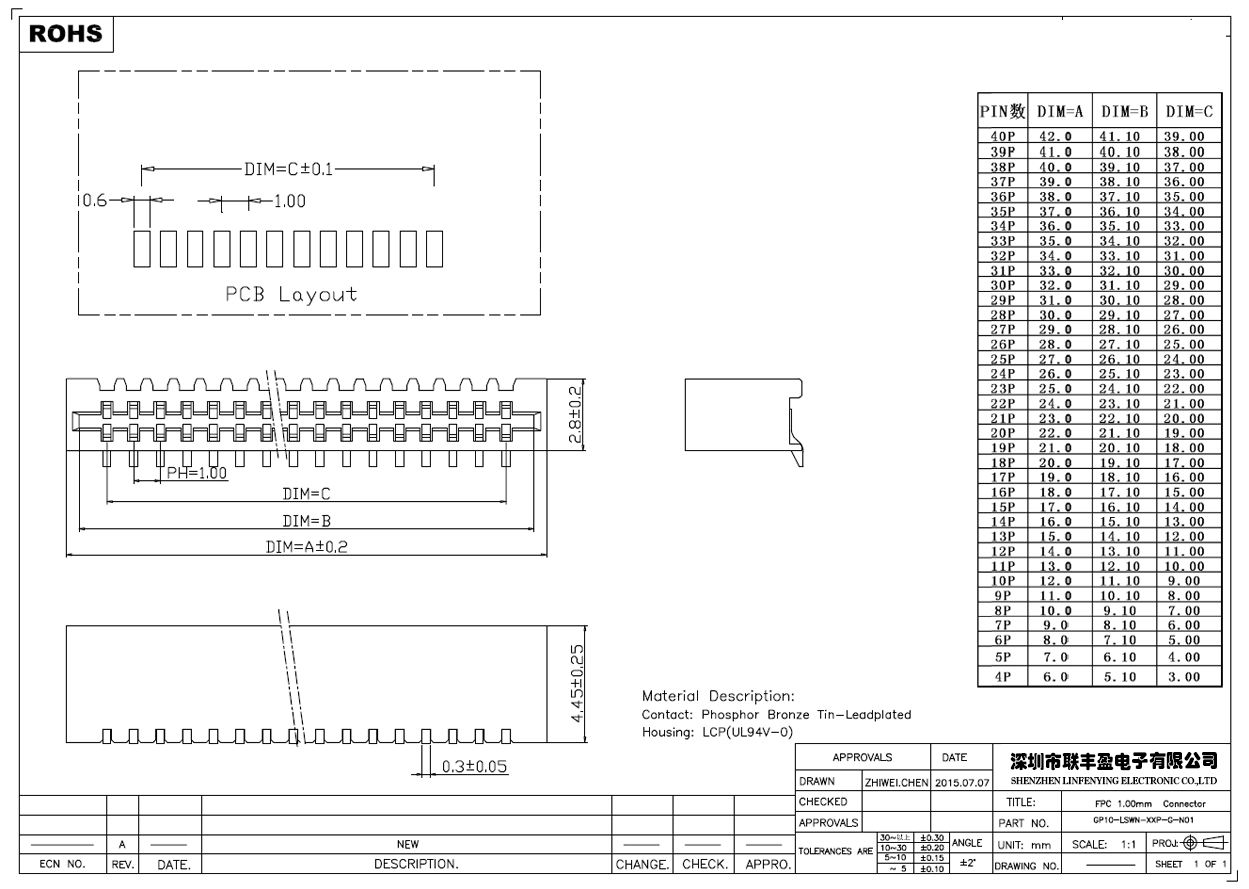 產品簡介品名:FPC連接器規格:立式貼片/180°間距:1.0mm/單邊PIN數:4P-40P高度:4.45mm