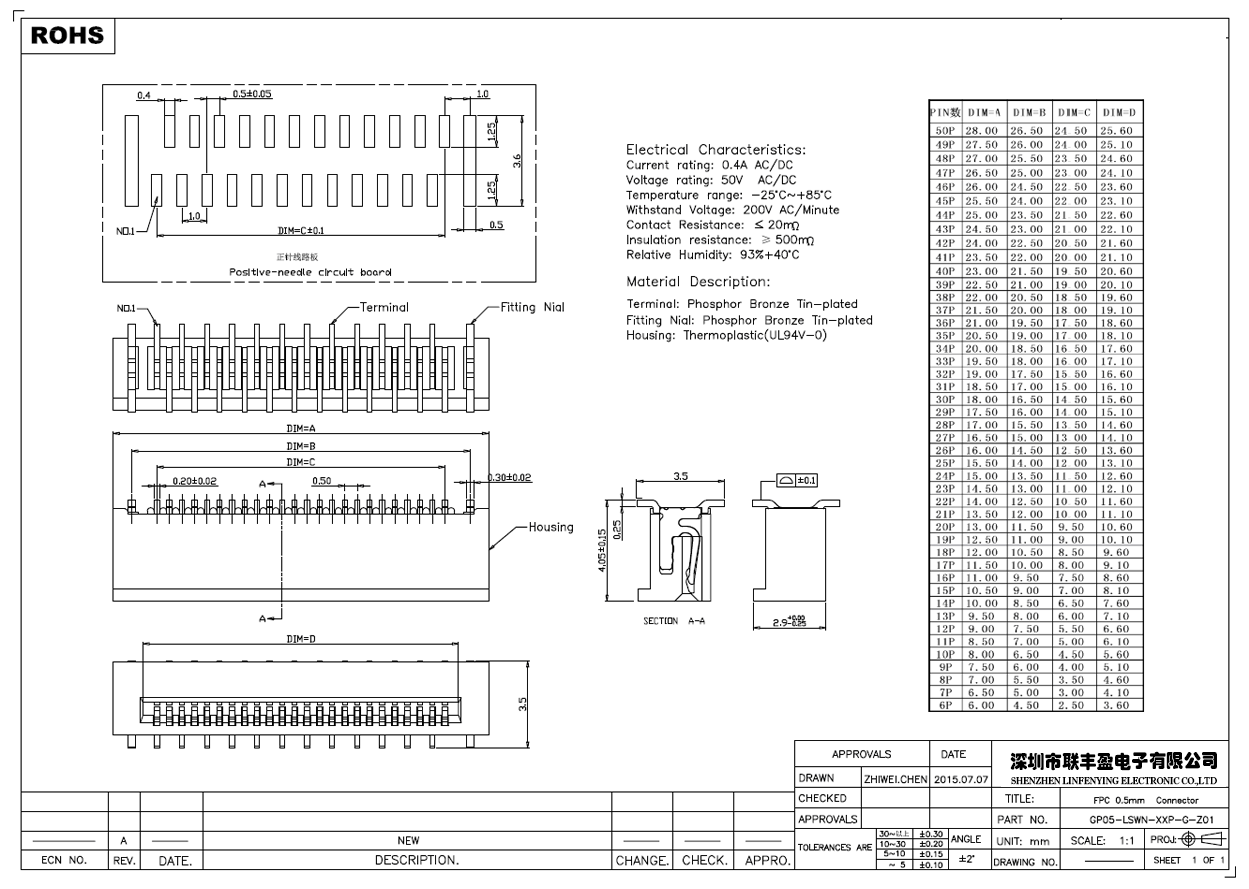 產(chǎn)品簡(jiǎn)介品名:FPC連接器規(guī)格:立式貼片/180°間距:0.5mm/無(wú)蓋正向PIN數(shù):6P-50P高度:4.05mm