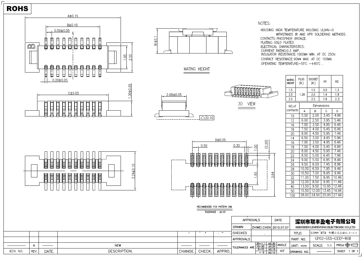 產品簡介品名:0.5mm單槽板對板連接器公座型號:LFY02-5xx-GxxP-WOR規格:0.5mm間距/立式180°PIN數:10-80PIN塑膠顏色:米黃色