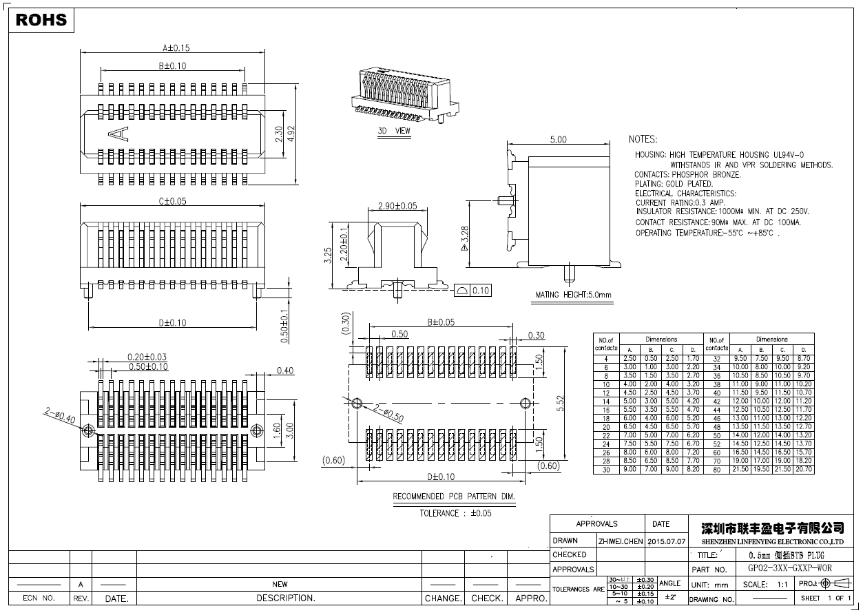 產品簡介品名: 0.5mm側插板對板連接器公座型號:LFY02-3XX-GxxP-WOR規格:0.5mm間距/臥式90°PIN數:4-80PIN塑膠顏色:米黃色