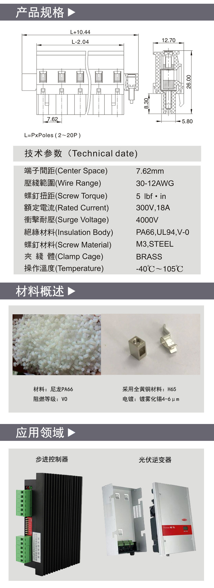 插拔式接線端子7.62間距180度直頭 300V 15A 02P-24P