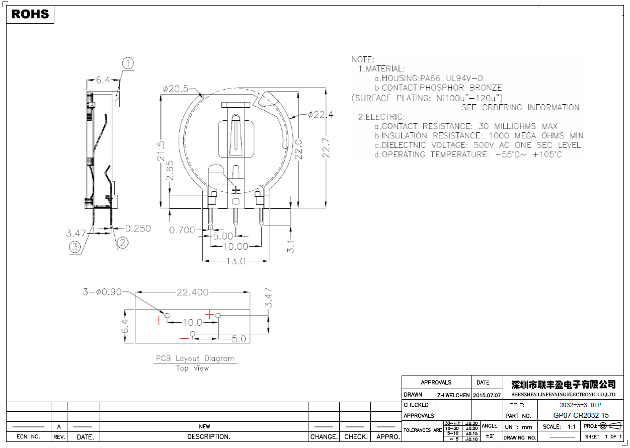 產品簡介品名:電池座產品型號:LFY07-CR2032-15電池型號:CR2032產品規格:DIP/插件式備注:黑色