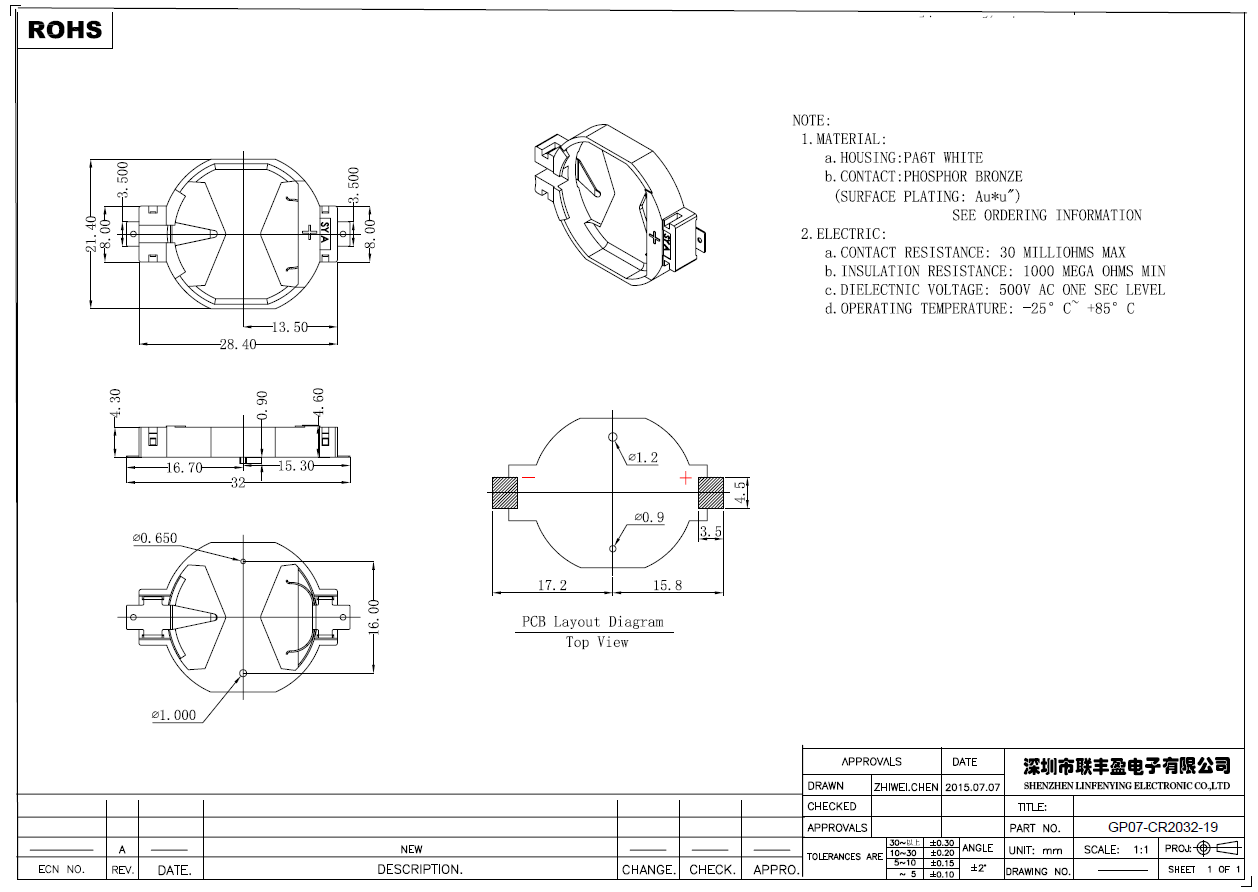 產(chǎn)品簡介品名:電池座產(chǎn)品型號:LFY07-CR2032-19電池型號:CR2032產(chǎn)品規(guī)格:SMT/貼片式備注:本色
