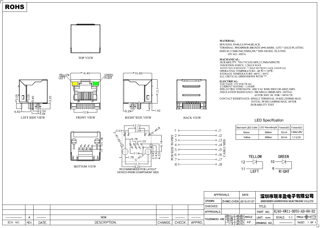 產品簡介品名:RJ45網絡連接器規格:臥式插件/90°外殼:帶屏蔽LED燈:黃/綠-其它顏色可定制塑膠顏色:黑色/其它顏色可定制
