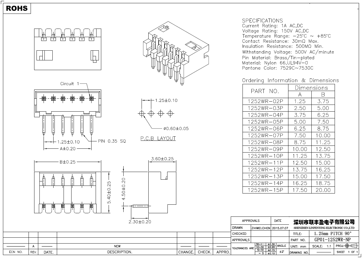 產品簡介品名:線對板連接器規格:臥式/插件90°間距:1.25mmPIN數:2-15PIN