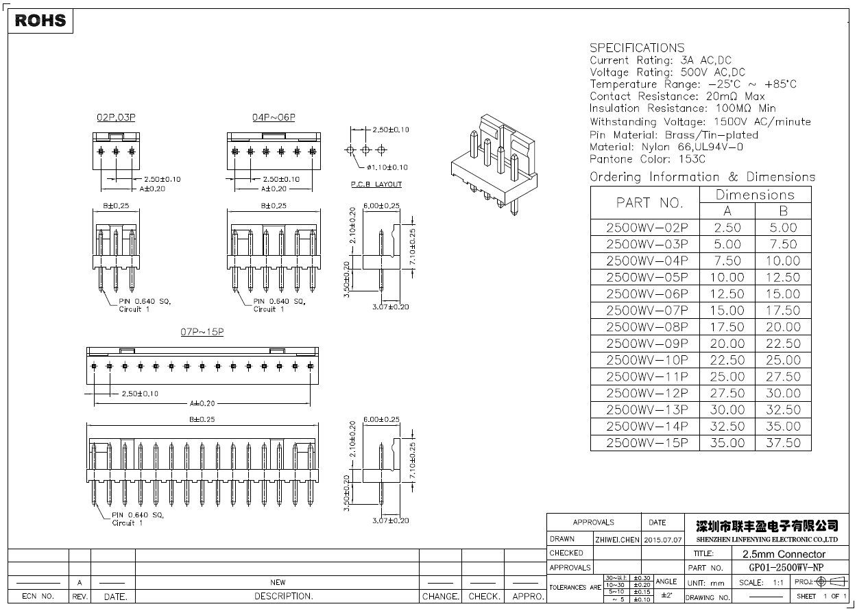LFY01-2500WV-NP產品簡介品名:線對板連接器規格:直式/插件180°間距:2.50mmPIN數:2-15PIN